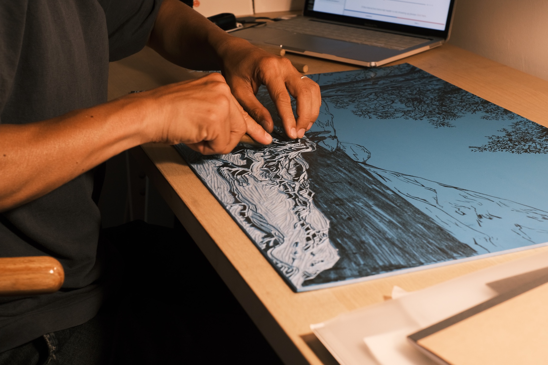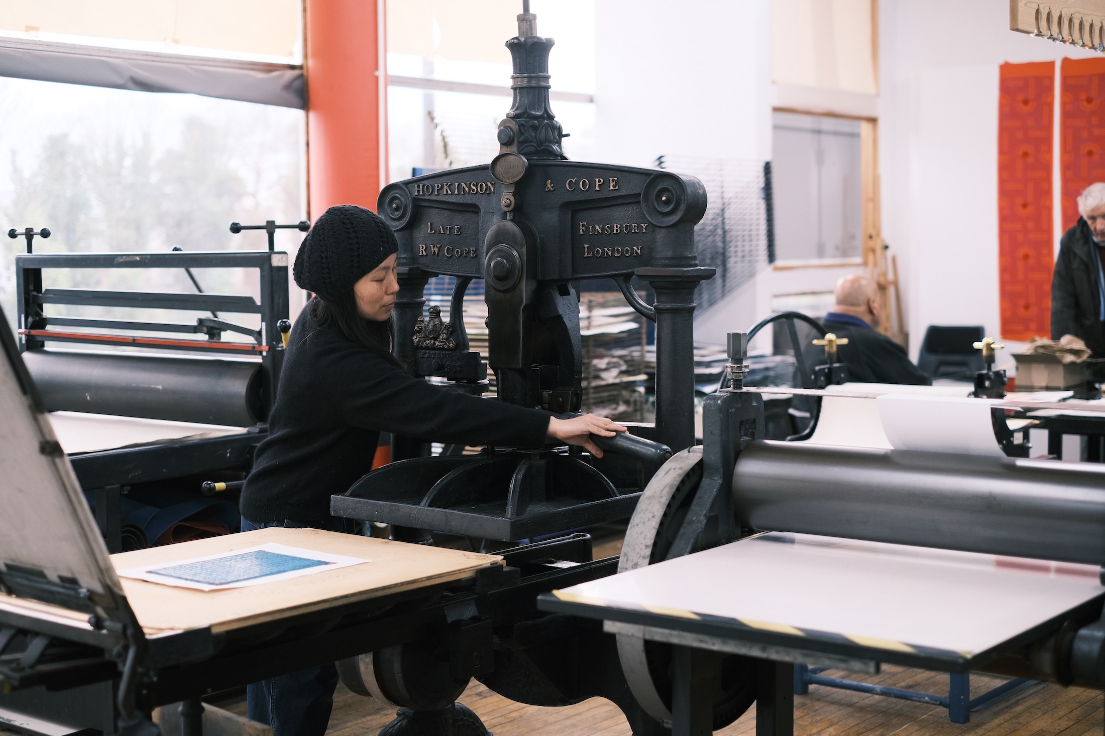 In our printmaking practice, we employ the linoleum relief printing technique, focusing on creating monochrome prints. We use both Japanese carving knives and the renowned Swiss brand Pfeil carving knives which are highly favored by printmakers. For our color palette, we rely on oil-based paints from Cranfield, a reputable British manufacturer. These paints are non-toxic and easily cleaned with soap—an essential consideration in our artistic process. When it comes to paper selection, we have a preference for the traditional Somerset printmaking paper, a 300gsm velvet soft white, known for its smooth texture. Typically, we conduct our printing in our own studio. We have also been fortunate enough to have visited the local art center, Spike Print Studio, for collaborative ventures. The establishment houses an array of traditional printing tools, and for the printmaking process, they primarily utilize the Albion Press. Produced in London in 1842, this historic printing press allows for the production of larger-scale prints. Working with it evokes a sense of raw spirit and inherent beauty.