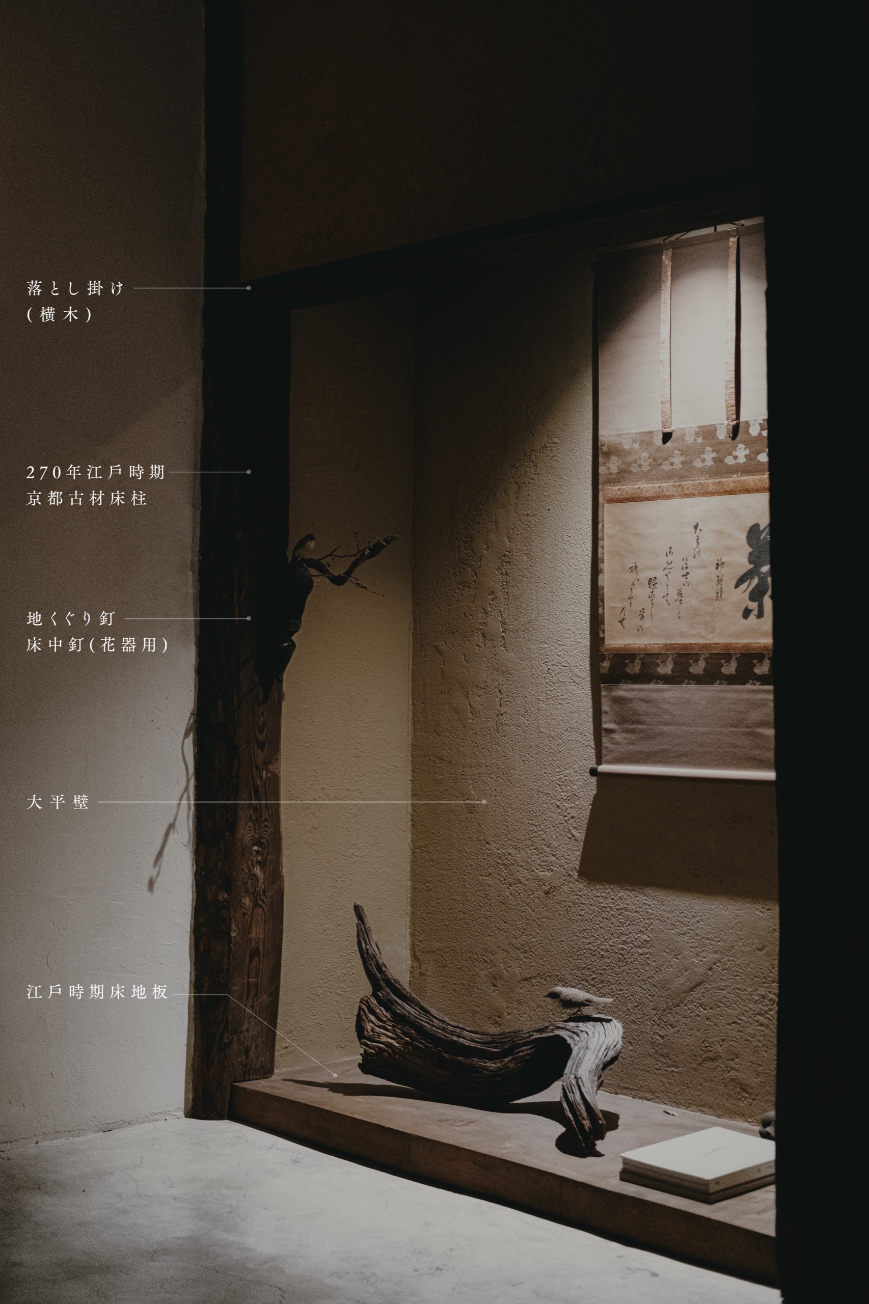 I later referenced the traditional architectural design manual Shoumei (匠明) by Hiranuma Masanobu, which highlights the most representative structure of oshi-ita found at the remains of the Ninomaru Palace in Kyoto. By the Edo period, this structure had evolved into what we now recognize as toko-noma. To create the tokonoma in my own shop, I sourced ancient materials from Kyoto, dating back 270 to 400 years, as a tribute to history.