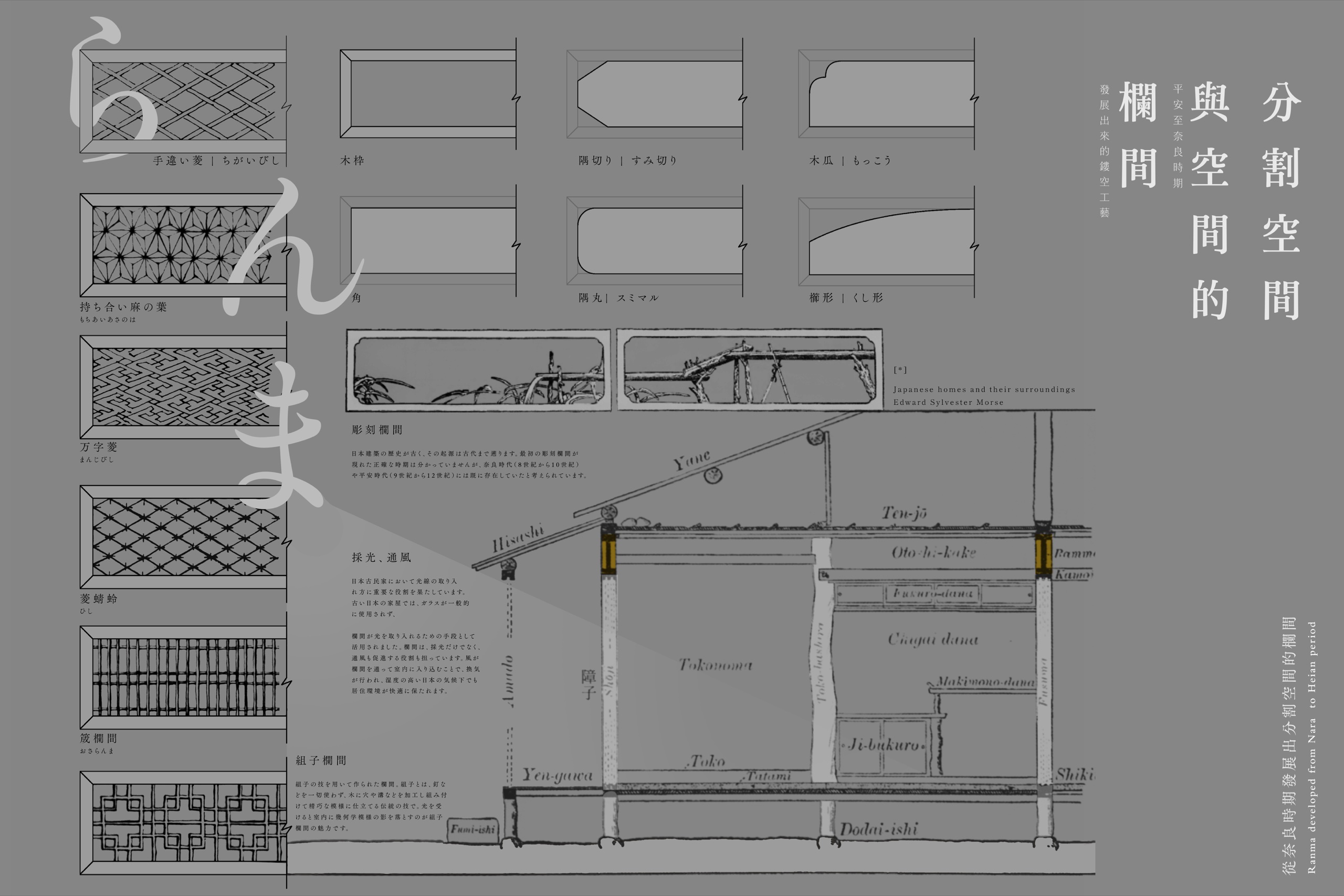 By using pillars to define space, the toko-noma developed alongside adjacent elements like toko-waki (床脇; space adjacent to a alcove) and chigai-dana. These features inspired various furniture and tools, including bun-jiki (文机; writing desk), kazari-dana (飾棚; decorative shelf), cha-tensu (茶箪笥; tea chest), fude-kae (筆返; brush holder), and hiki-do hiritsu (引戶比例; measurements used in the design of sliding doors) during the Meiji to Taisho periods. Looking at the aesthetics of ma from a different perspective reveals that in traditional homes, ranma are often found at a height of six shaku one ma. These transom windows are known for their intricate openwork carvings. Positioned between the ceiling and the lintel, they not only divide the space but also add unique details that reflect the region’s heritage, enhancing the simplicity of rooms from the Edo to Meiji periods.