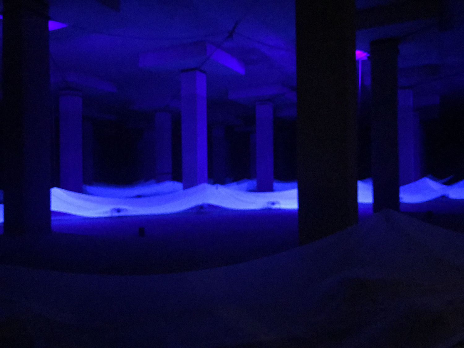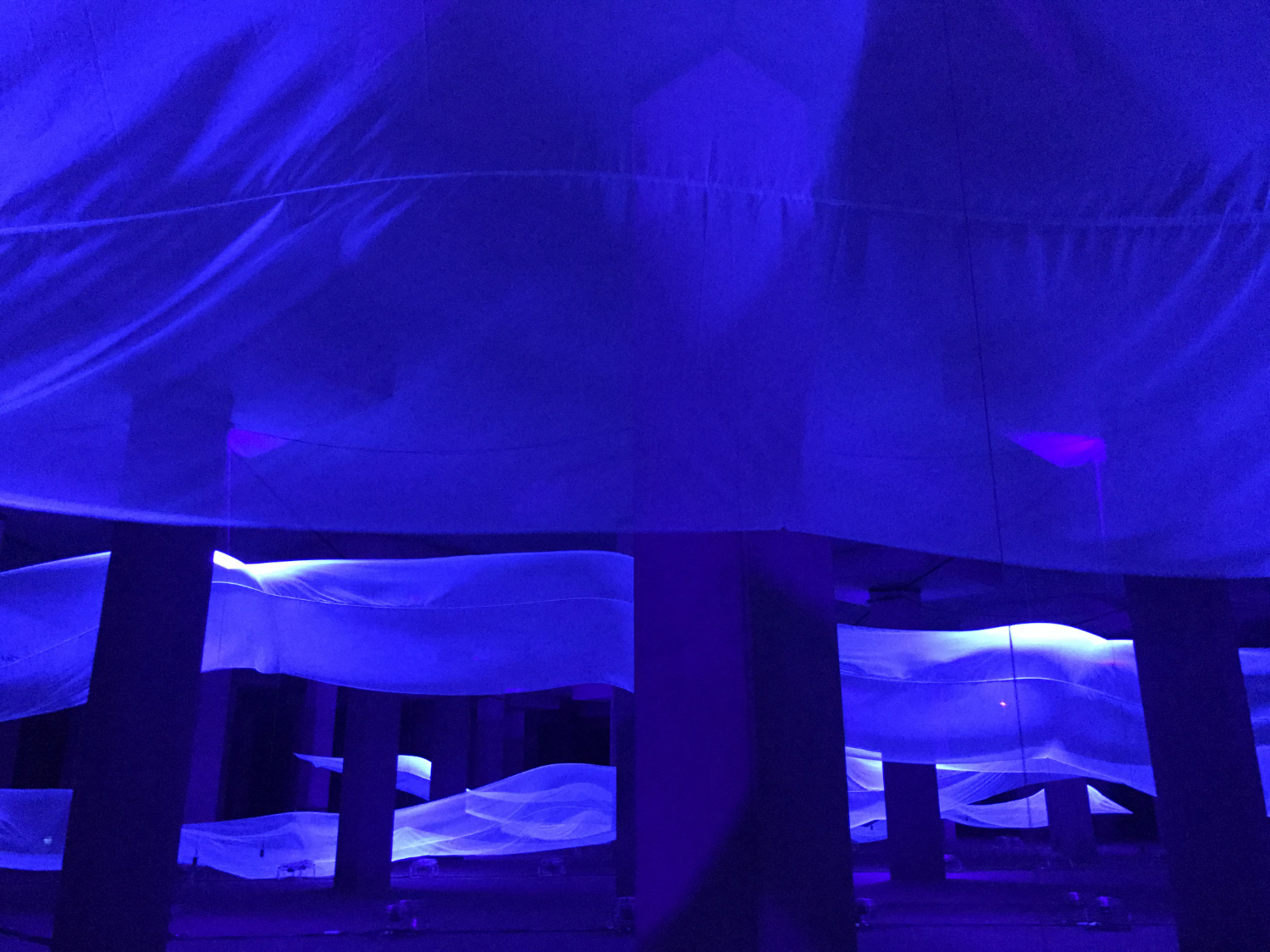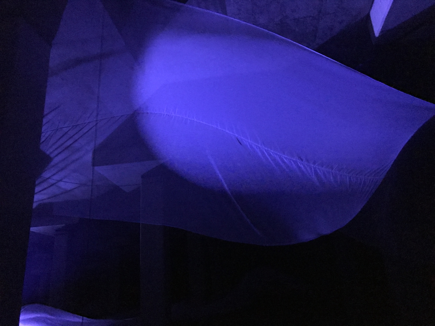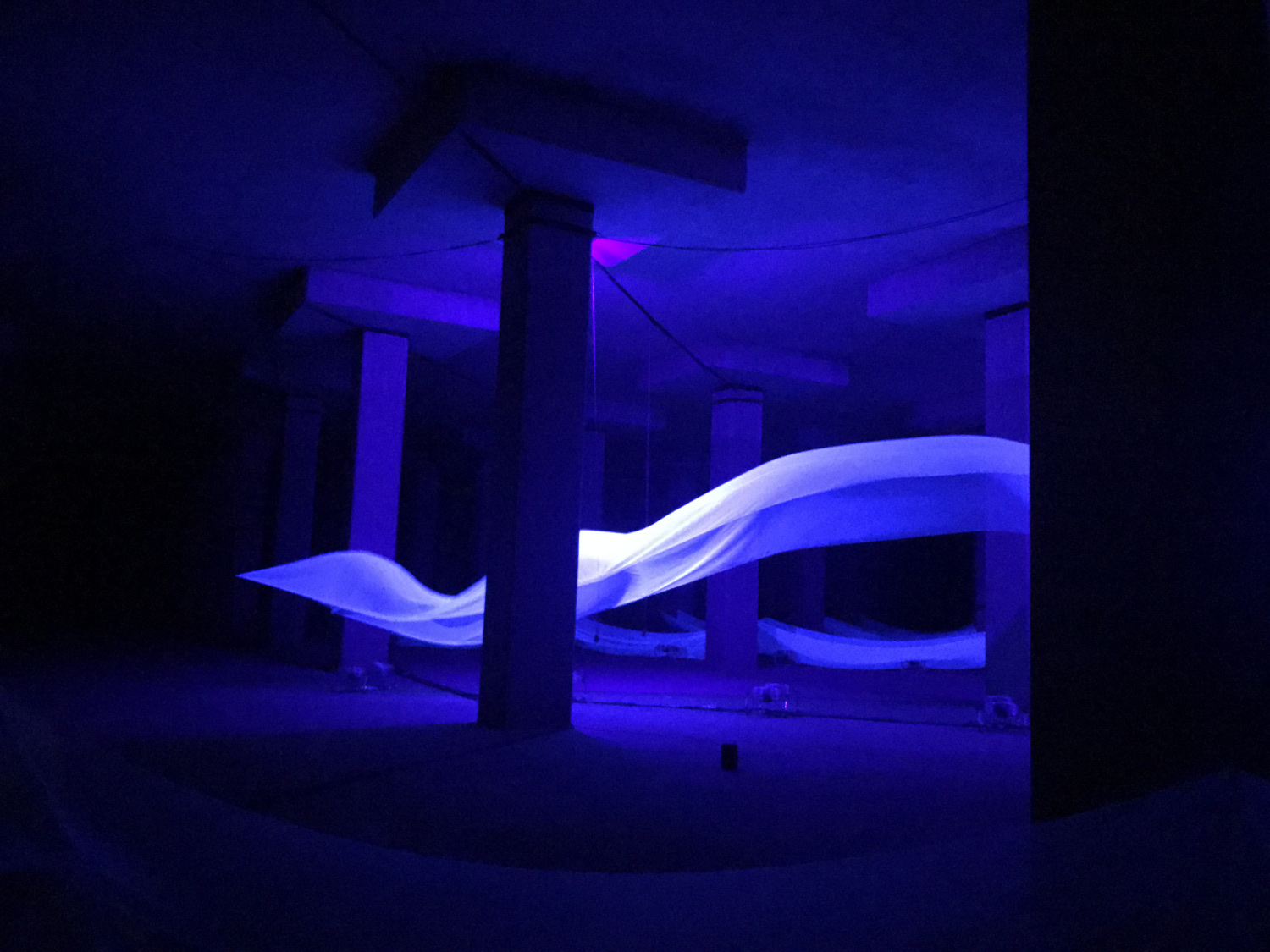 八分鐘的裝置演出,觀眾先在音樂引領下來到蓄洪池的入口,然後慢慢進入在平常日子是禁區的蓄洪池。伍韶勁並沒有用藝術手法去改變這個地下世界的本貌,飄浮在光影中的白布像波浪,也是流動著的水,在這個廣闊的場域中,錯落有致地升降,從前景到後方,彷似將雨季時暫存在這裡的雨水,及被排放到大海的整個過程詩意地重現一次。伍韶勁說他的創作意念是cast light,雖然光的照耀讓事物被看見,但重點在於事物的本義,所以他並沒有在這廣深而獨特的場域中,做出滿有野心的作品,他只想讓這個地方 —— 在城市中心地下的蓄洪池 —— 被大眾知曉。