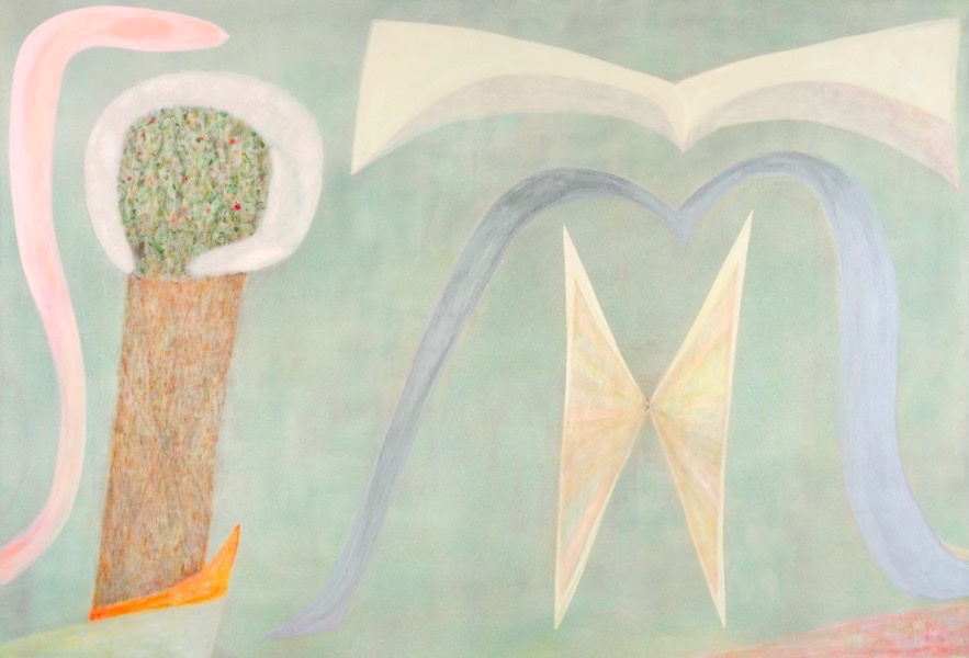 The works of Hiroshi Sugito often depict dreamy landscapes containing houses, boats in the vast ocean, trees, snow and mountain forests. Various shapes and contours seemingly frolic on his canvas amongst hues of pink, mossy green and sky blue, exuding both a child-like candor and a frenzy of energy. The ebb and flow of emotions in Sugito’s works are foggy and indistinct, as if striving in futility to capture the totality of visions from a dream.