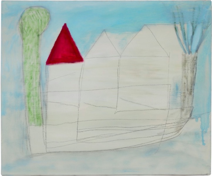 房屋與船和大海、樹木與雪和山林。杉戶洋的畫都是風景畫,幾何圖形的、粉紅的、嫰綠的、天藍的,色線與線條都是簡單的,有點稚氣,也有點混沌,說不清的情感起伏,彷彿是夢中的一片風景,嘗試在畫布上摹臨,希望將之描畫得俱像,卻始終含糊一片。