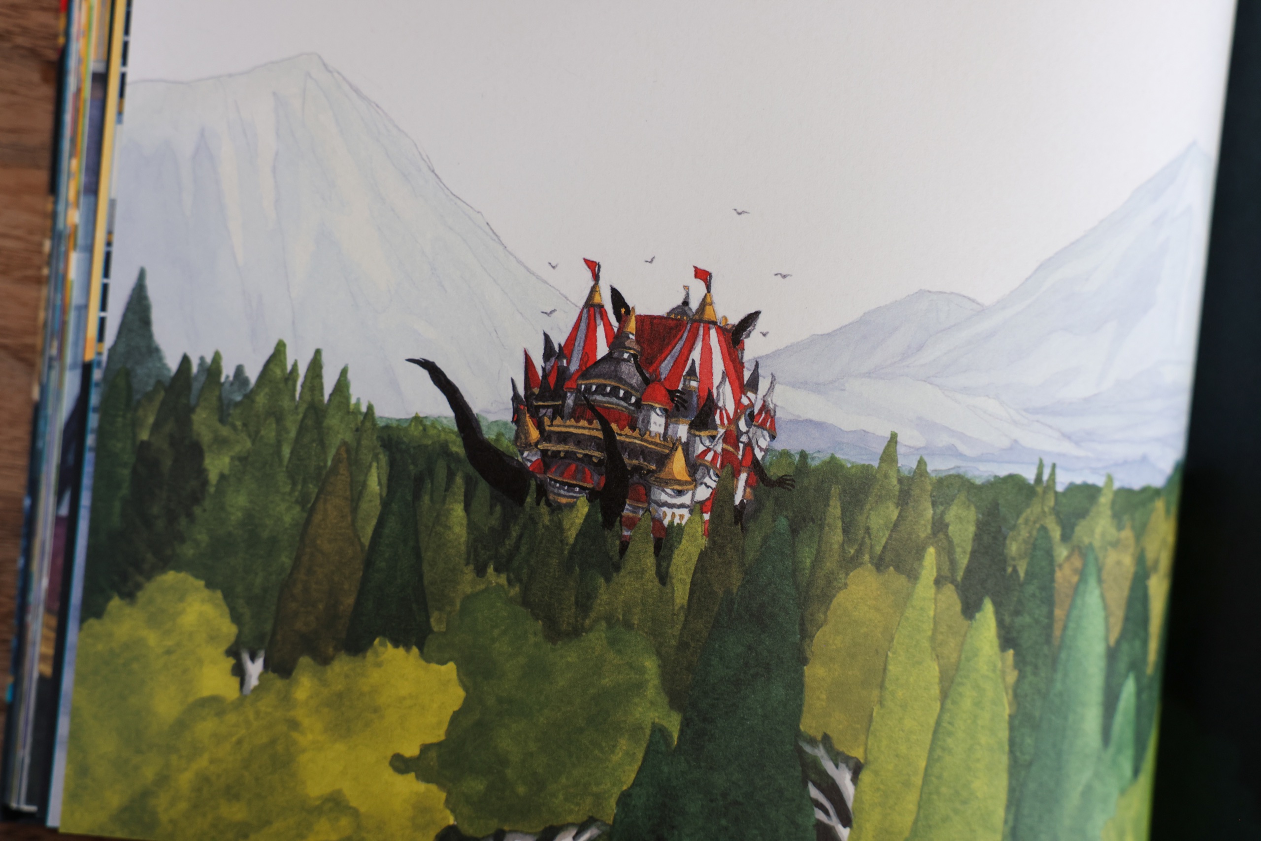 In the morning, the children stood on the empty streets, the monsters having departed. The final drawing shows Monster Park moving slowly through the forest towards distant mountains. Is this the scene after the children had sent the monsters home? I can’t help but imagine that after returning the monsters, the children were invited into Monster Park, where they enjoyed a strange yet delightful afternoon tea at a round wooden table lined with a white cloth.