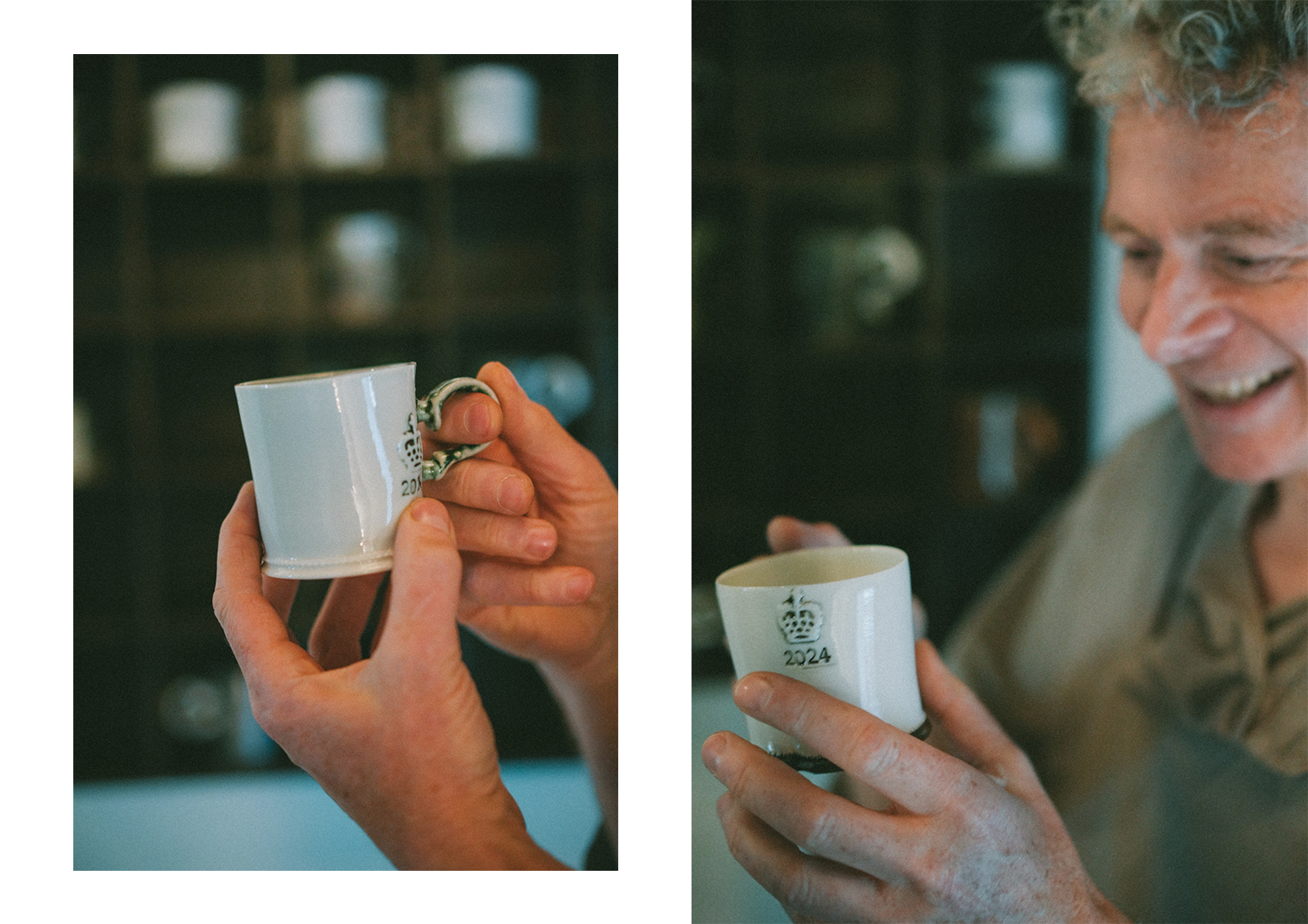 想起初次使用到Harrison的杯子,是在他2021年的「Mug-Cup: A Thirty-Year Retrospective」展覽,由九十年代至今,在創作這小小的容器上,他一直尋求變化。「展覽中有他最著名的作品——瓷泥和陶泥結合的杯子,這兩種不相融的物料很容易在燒製過程中破裂,但他找到了成功的秘訣。這系列很受歡迎,若他大量製作,一定能賺很多;但他沒有,相反地一直挑戰自己作不同的嘗試,這種精神令人很佩服。」展覽的策展人Alex說,他們合作的五年間,一直看到Harrison在創作上的轉變,好像他說不想再做桌子了,只因不想被定義為家具設計師,他還是想專心做杯子。直至上月他首次來香港舉行「最後的晚餐」(Last Supper)展覽,接觸他本人後,立即被他對陶藝的熱情所感染,談話中他拿著自己做的杯子,一直說:「它真的很美麗!對我來說是如此完美!」他笑說,「我經常在家一邊細看、一邊讚嘆它們,這時候,我太太Julia會以奇怪的目光問我在做什麼,我會說我只是看著它們。」這時我們才明白,原來接觸到創作者本人,更喜歡他的作品是真的呢。