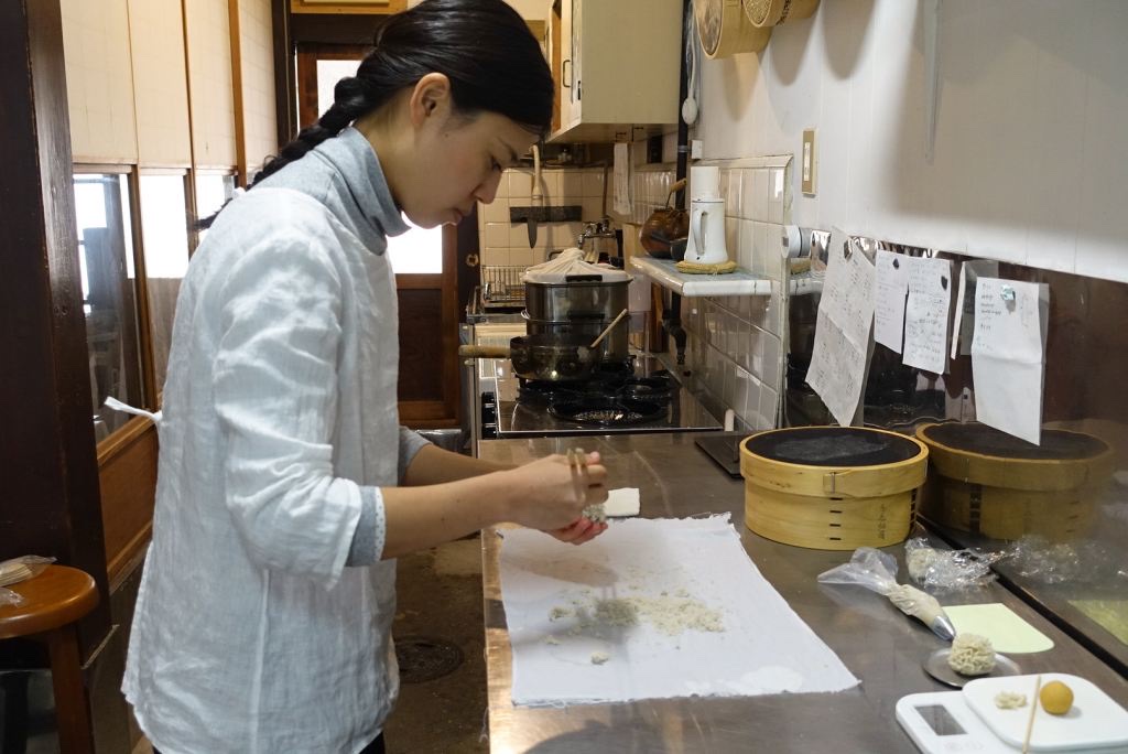 Using a bamboo fork to carefully cut up a small piece of wagashi. This piece of purple-ish white confectionery just effortlessly melted in my mouth, and it tasted… savoury! Although Sayoko Shugiyama, the wagashi maker, already told me that this is not sweet, I didn’t imagine it to be so savoury. I was totally surprised by the saltiness and the slightly tongue-tingling bite. After all these unexpected attacks of taste, my mouth was filled with a fragrance of tangerine.