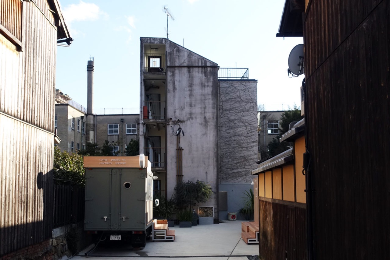 The hotel lobby has a classy and well-furnished interior, on the contrary, the corridors were deliberately kept in its primitive forms. The metal gate is tattered, the fences and handrails are visibly rusty. Hotel guests would find a sudden change of vibe again once they enter the hotel room, in which a tidy and comfy tiny living room awaits. The custom-made bed uses a minimalistic westernized design, while the bathroom, which has a beautiful tile wall, uses the typical machiya townhouse sliding door. After removing the wall paint from the building’s residential phrase, the worn-out concrete wall underneath is exposed. Even the old screw holes on the wall are still to be seen. These traces all help to demonstrate to the guests the history and story of the building. As for the hotel logo, it is simply adopted from a graffiti someone randomly scribbled on the old front door.